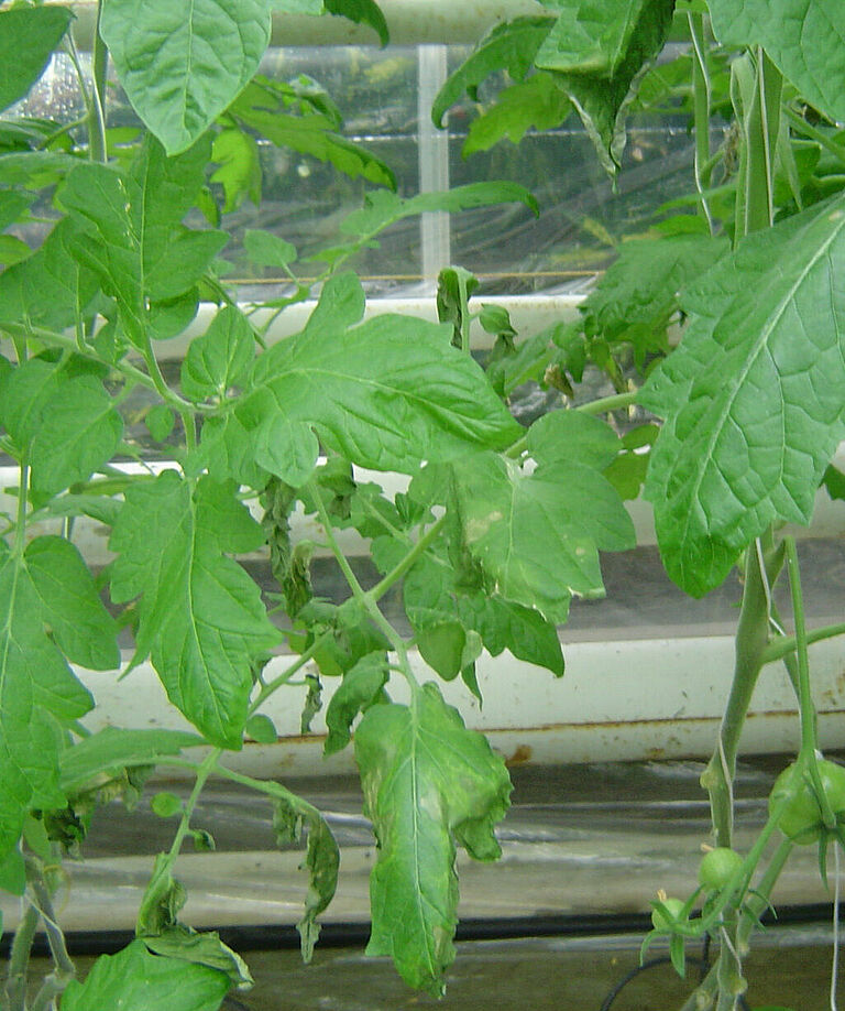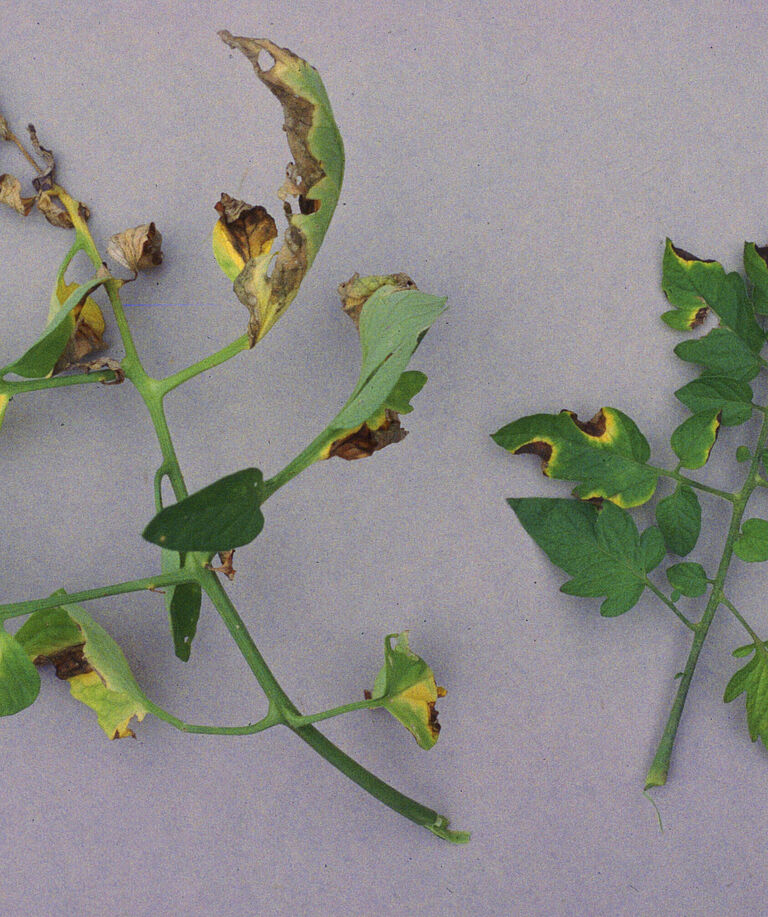 Το Clavibacter προκαλεί κηλίδες επάνω σε βλαστούς, φύλλα και καρπούς. Τα φύλλα και οι βλαστοί μαραίνονται. Στα κάτω φύλλα εμφανίζονται λευκές αλλοιώσεις που μοιάζουν με φουσκάλες, οι οποίες αργότερα γίνονται καφέ και μπορεί να συγχωνευθούν. Τα φύλλα μαραίνονται και συστρέφονται προς τα πάνω, ξεκινώντας συχνά από τη μία πλευρά του φυτού. Γίνονται καφέ αλλά δεν πέφτουν. Στους μίσχους και τους βλαστούς σχηματίζονται αχνές λωρίδες οι οποίες στη συνέχεια σκίζονται, επιτρέποντας έτσι να σχηματιστούν εξελκώσεις. Στα φύλλα του φυτού της τομάτας εμφανίζονται υδαρείς αλλοιώσεις, συνήθως λευκού χρώματος με καφέ στο κέντρο τους.