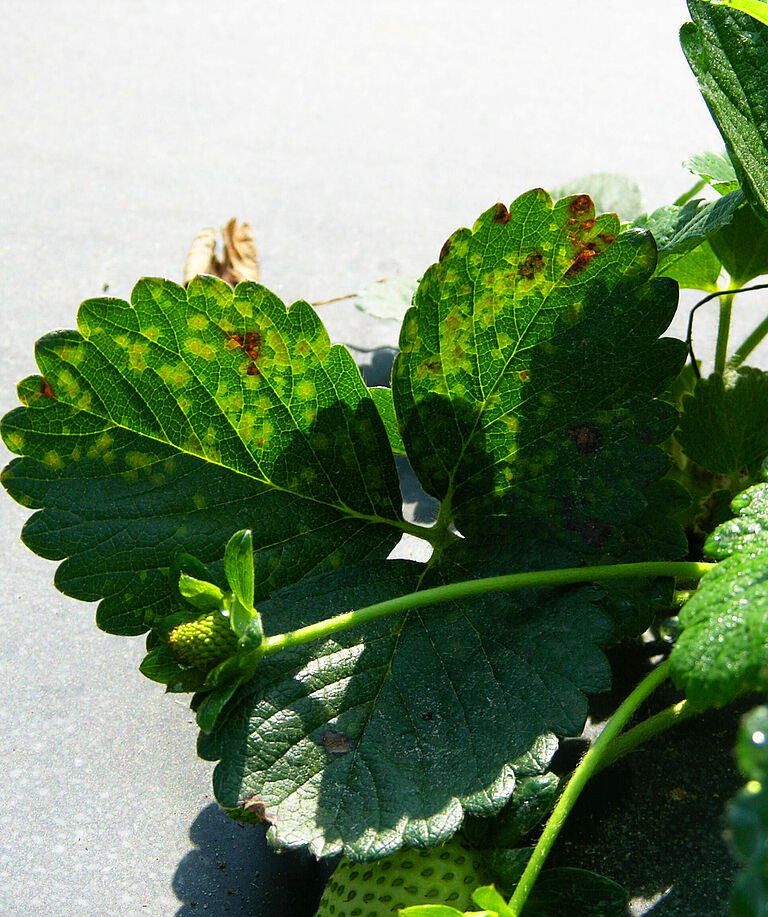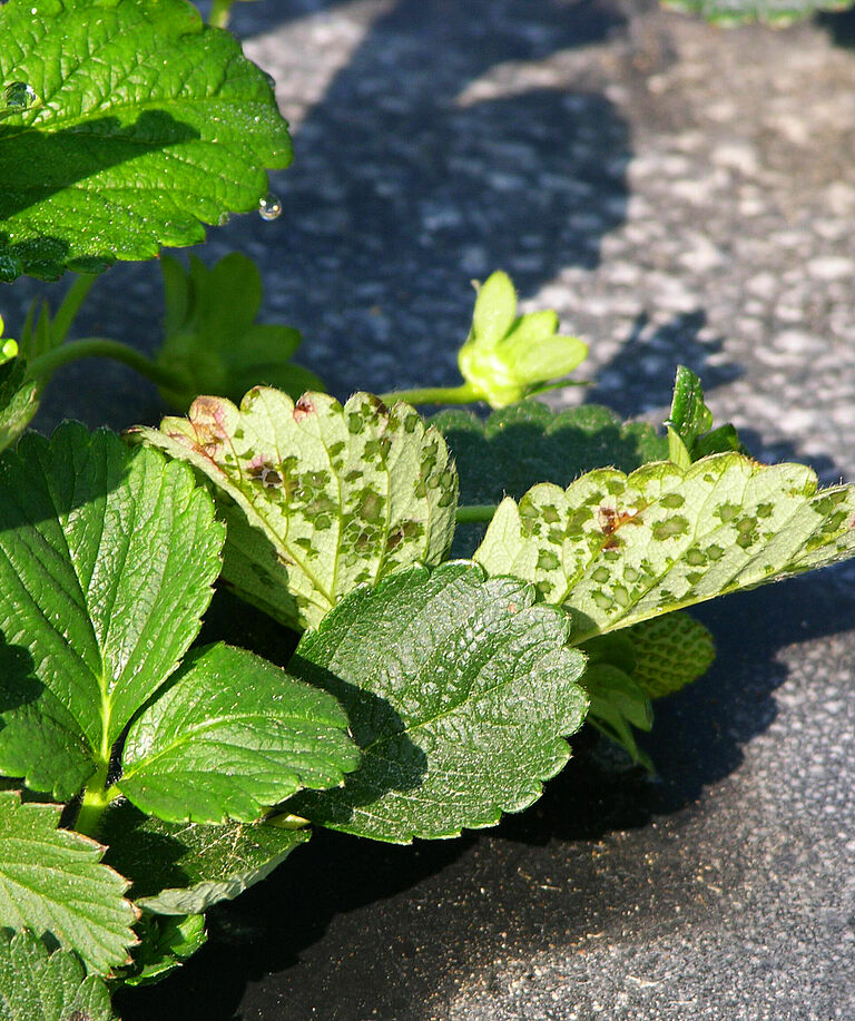 Το Xanthomonas fragariae αρχικά προκαλεί μικρές υδαρείς αλλοιώσεις στην κάτω πλευρά των φύλλων. Αυτές διευρύνονται και γίνονται γωνιακές κηλίδες που συχνά περιορίζονται από τις μικρές νευρώσεις. Το χαρακτηριστικό γνώρισμα είναι η εμφάνιση των αλλοιώσεων όταν χρησιμοποιούνται διαφορετικές πηγές φωτός: όταν χρησιμοποιείται ανακλώμενο φως, οι αλλοιώσεις φαίνονται σκούρες πράσινες αλλά όταν χρησιμοποιείται το μεταδιδόμενο φως είναι ημιδιαφανείς. Σε συνθήκες υγρασίας, σχηματίζεται ένα παχύρρευστο βακτηριακό εξίδρωμα στην κάτω πλευρά του φύλλου. Αυτό το εξίδρωμα μετατρέπεται σε μια λευκή μεμβράνη όταν στεγνώσει. Οι αλλοιώσεις μπορεί να συγχωνευθούν καθώς μεγαλώνουν και αργότερα να γίνουν επίσης ορατές στην επάνω πλευρά του φύλλου ως ακανόνιστες κηλίδες που είναι πρώτα κοκκινοκαφέ και στη συνέχεια νεκρωτικές. Τα συμπτώματα του φυλλώματος είναι τα πιο σημαντικά, αλλά και όλοι οι τύποι αγγειακού ιστού της κορυφής μπορούν να μολυνθούν, δημιουργώντας μια εμφάνιση παρόμοια με αυτή της μόλυνσης Phytophthora fragariae.