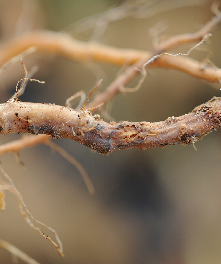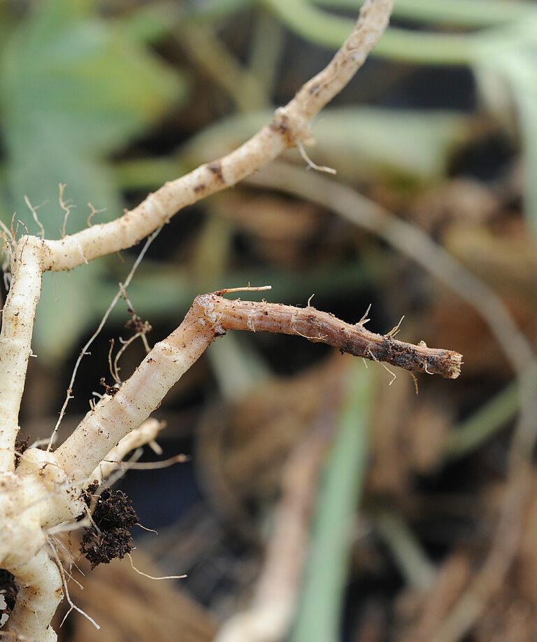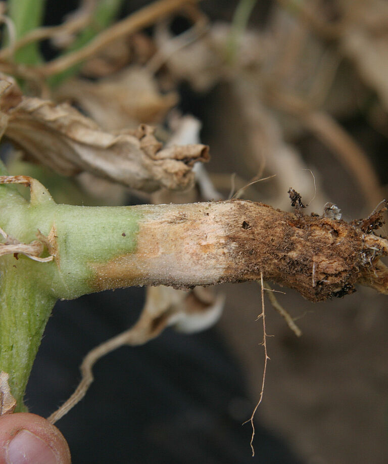Η ασθένεια συνήθως περιορίζεται σε μερικές από τις ρίζες, αλλά σε σοβαρές περιπτώσεις όλες οι ρίζες μπορεί να μολυνθούν. Στο τελικό στάδιο της ασθένειας, μένει μόνο ο αγγειακός ιστός επειδή ο φλοιός (εξωτερικό στρώμα) έχει αποσυντεθεί. Η μόλυνση στα αρχικά στάδια της καλλιέργειας έχει ως αποτέλεσμα την καθυστέρηση της ανάπτυξης ενώ τα μικρότερα φύλλα αποκτούν ένα έντονο πράσινο χρώμα. Η σοβαρή μόλυνση σε αυτό το στάδιο μπορεί να καταστρέψει τα φυτά. Σε περίπτωση λιγότερο σοβαρής μόλυνσης, τα αμπέλια μπορεί να μαραθούν σε μεταγενέστερο στάδιο της καλλιέργειας, αλλά όταν η παροχή νερού είναι με οποιονδήποτε τρόπο περιορισμένη κατά τις προηγούμενες περιόδους υψηλής εξάτμισης, ο μαρασμός μπορεί να συμβεί νωρίτερα. Στα μαραμένα φυτά, η κορυφή αποκτά αρχικά μια υδαρή όψη, γίνεται σκαφτή και το χρώμα της είναι ανοιχτό καφέ που αργότερα γίνεται μαύρο με πορτοκαλί εξιδρώματα σπορίων. Τα πρώιμα στάδια του μαρασμού είναι δύσκολο να διακριθούν από άλλες ασθένειες που προκαλούν μαρασμό.