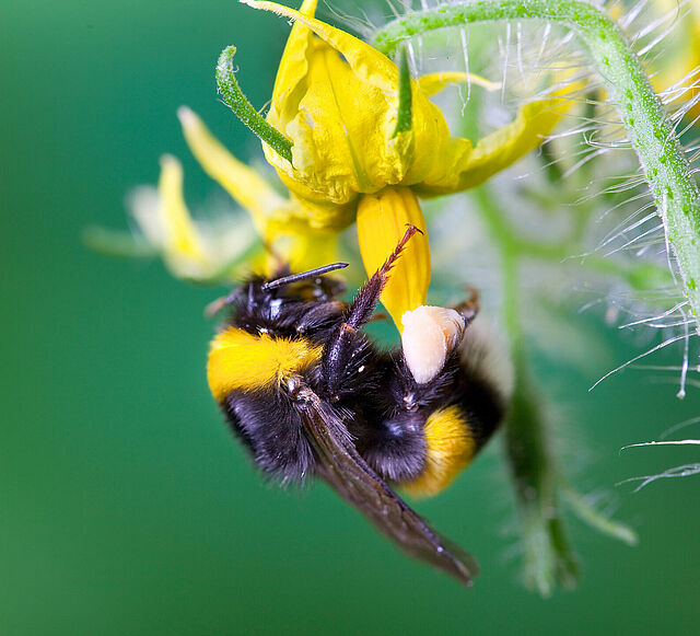 During pollination, a bumblebee bites onto the flower and makes the flower vibrate. This is known as buzz pollination. The imprints of the bumblebee's jaw on the flower (bite marks) turn brown within one to four hours and make it possible to check the bumblebees' work. A single visit results in the transfer of enough pollen for pollination. Fruit setting takes place once a flower has been pollinated.