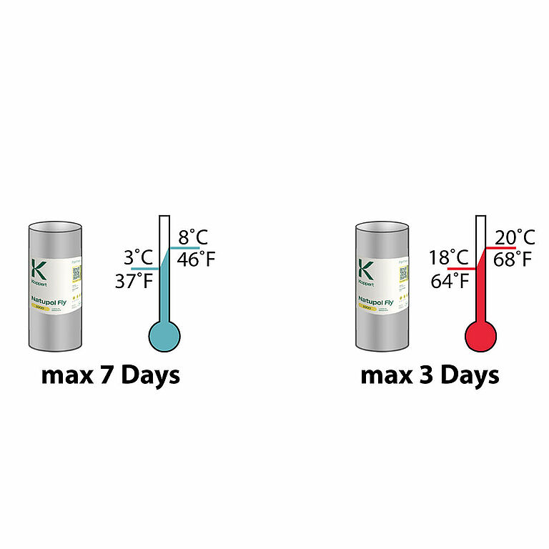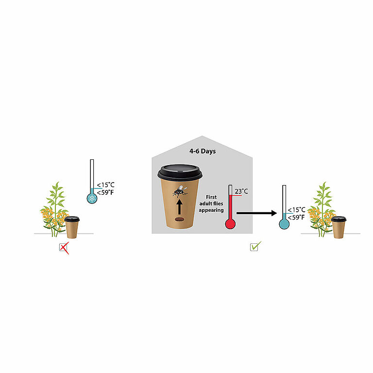 Do not release Natupol Fly without preparation if the temperature is below 15 ˚C. The outcome will be unpredictable and will often take longer than a week. In the event of having to use Natupol Fly at a temperature below 15 ˚C, first mature them in a warm environment. Release Natupol Fly once the first fully-grown flies have emerged.