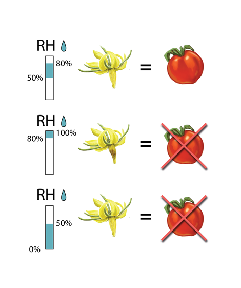 Pollen is released best at a relative humidity (RH) of between 50% and 80%. A relative humidity of more than 80%-85% will result in pollen not being released and the bumblebees will become inactive. Below 50% RH, the germination capacity of the pollen decreases, potentially resulting in problems with fruit setting. The bumblebees will still collect pollen, and leave bite marks, but no fruit will grow.