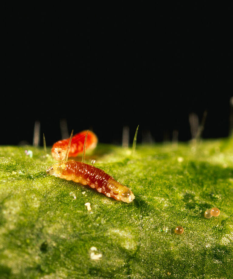 Προνυμφικό στάδιο: Το χρώμα της προνύμφης είναι συνήθως πορτοκαλί, αλλά μπορεί να ποικίλλει ανάλογα με το χρώμα του θηράματος που καταναλώνεται και μερικές φορές μπορεί να είναι κίτρινο ή κόκκινο. Αμέσως μετά την έξοδό της από το αυγό, η προνύμφη έχει κιτρινωπό λευκό χρώμα. Τα αυγά και τα πρώτα προνυμφικά στάδια είναι πολύ δύσκολο να βρεθούν στην καλλιέργεια λόγω του μικρού μεγέθους και του χρώματός τους.