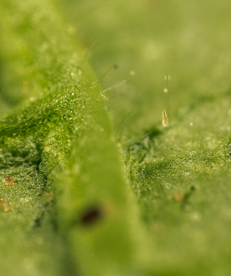 Ενήλικο στάδιο: Καθώς προχωρά η ανάπτυξη, εμφανίζεται μια κόκκινη κηλίδα μπροστά από τη μέση γραμμή, μετά την οποία ολόκληρη η προνύμφη γίνεται πιο σκούρα. Τέλος, εμφανίζονται λευκές κηλίδες στο σώμα. Μια πλήρως ανεπτυγμένη προνύμφη έχει μήκος περίπου 2 mm. Στο τέλος του τελευταίου προνυμφικού σταδίου, η προνύμφη κλωσάει ένα λευκό κουκούλι κοντά σε μια φλέβα φύλλου και νυμφώνεται μέσα σε αυτό.